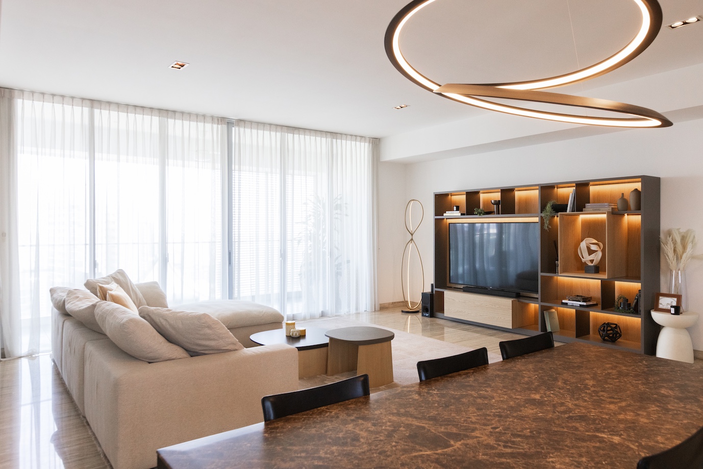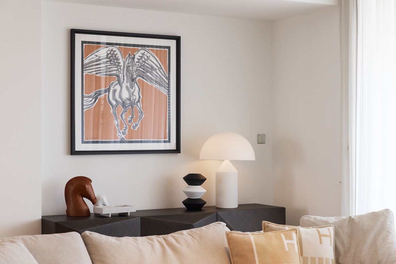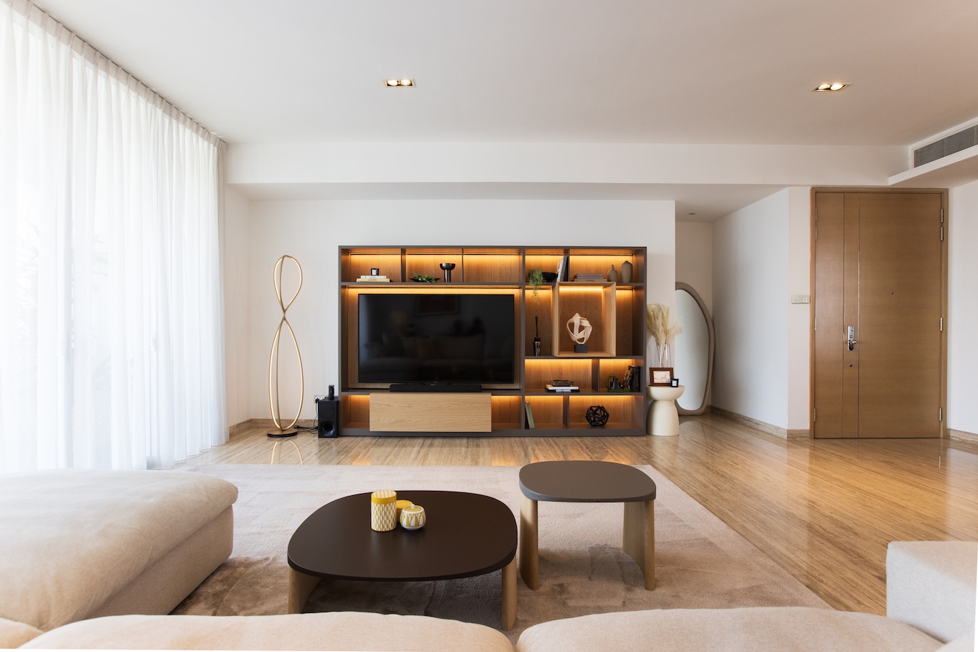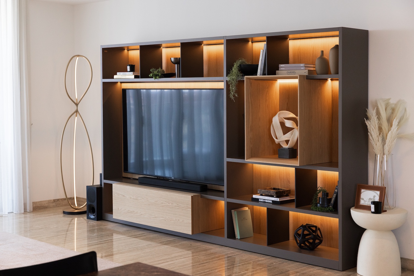 今回、最もこだわったのはリビングの主役であるテレビ周り。既存のIKEAのテレビウォールを思い切って撤去し、収納家具の最高峰とも言える Molteni&C にて、セミオーダーのウォールユニットを仕立てました。 シェルフのデコレーションは、クライアントと丁寧にセレクトショップを巡り、アートピースのように一点一点吟味。造形のバランスと余白までも計算し、上品な存在感を放つ構成へと仕上げています。