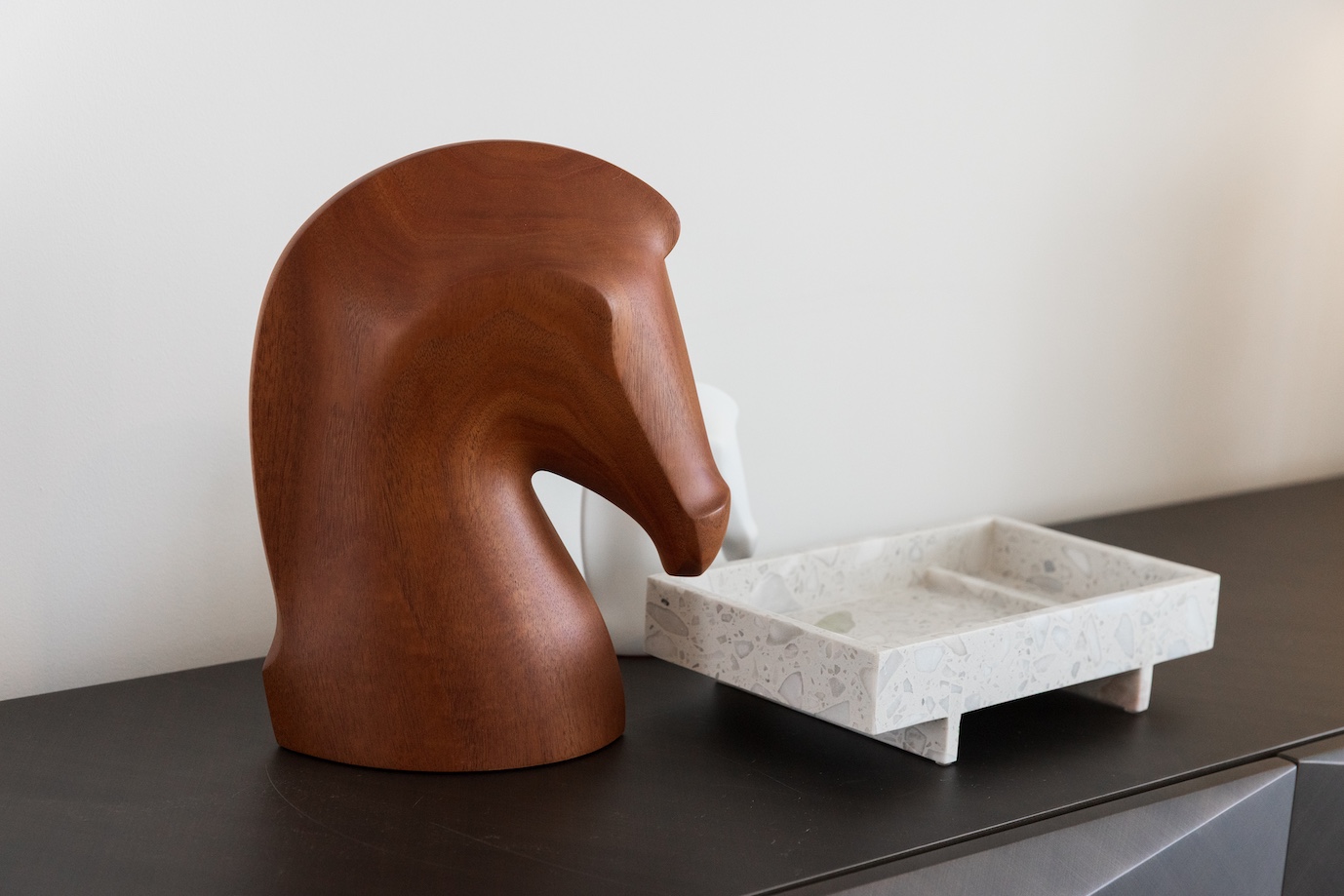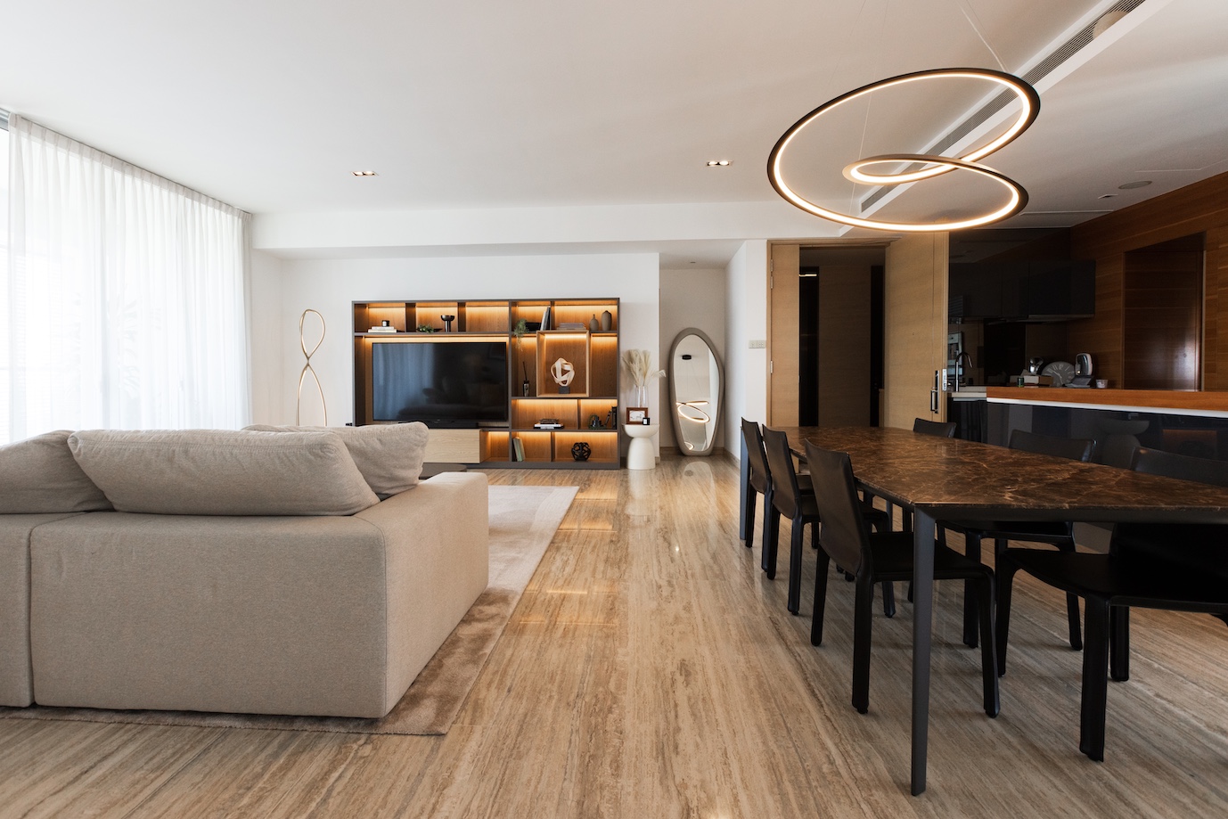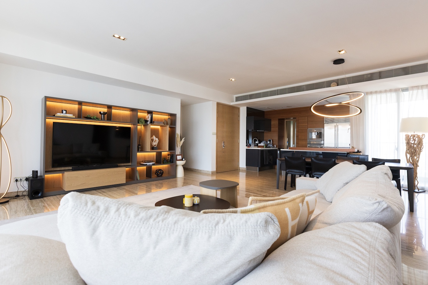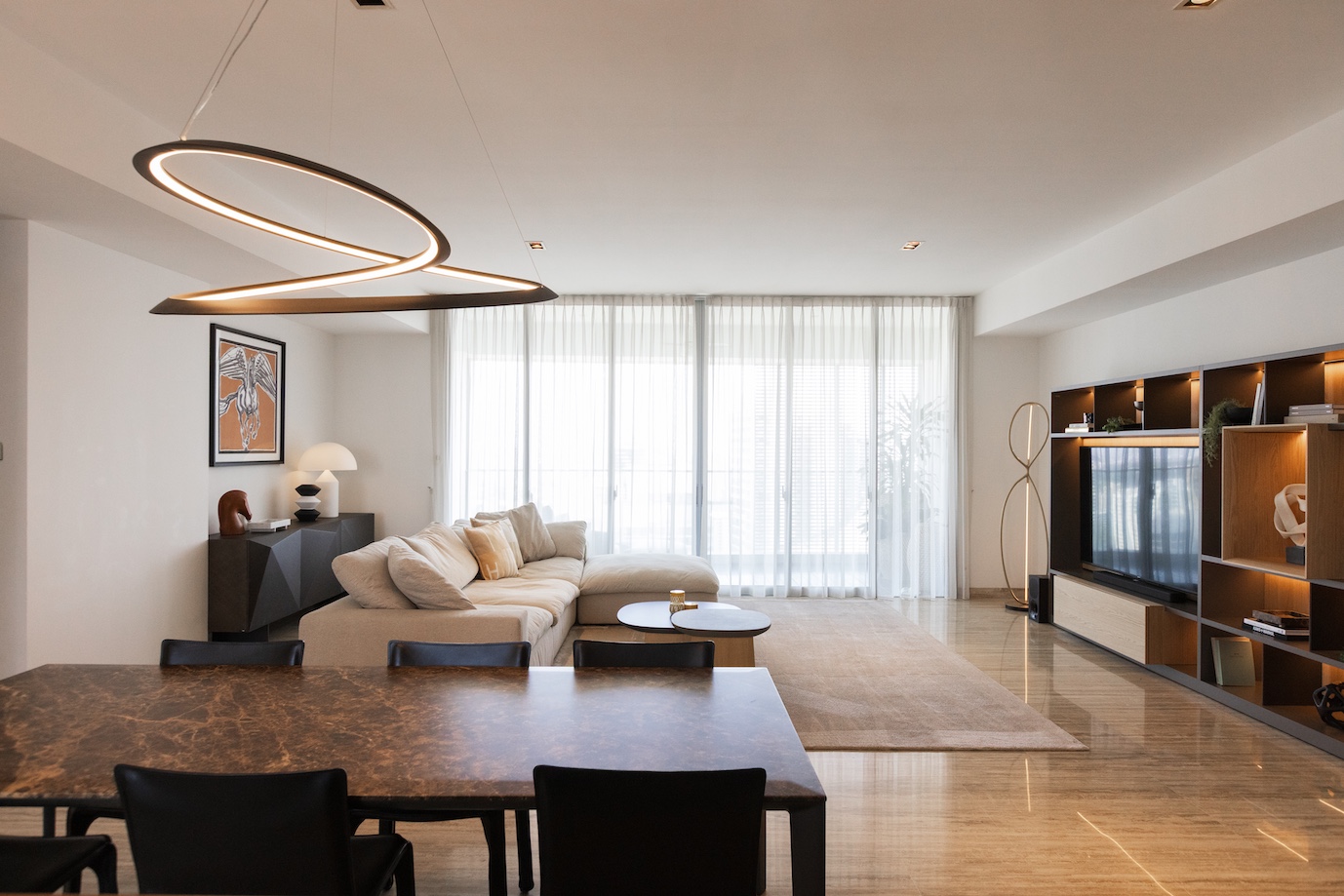 今回、最もこだわったのはリビングの主役であるテレビ周り。既存のIKEAのテレビウォールを思い切って撤去し、収納家具の最高峰とも言える Molteni&C にて、セミオーダーのウォールユニットを仕立てました。 シェルフのデコレーションは、クライアントと丁寧にセレクトショップを巡り、アートピースのように一点一点吟味。造形のバランスと余白までも計算し、上品な存在感を放つ構成へと仕上げています。