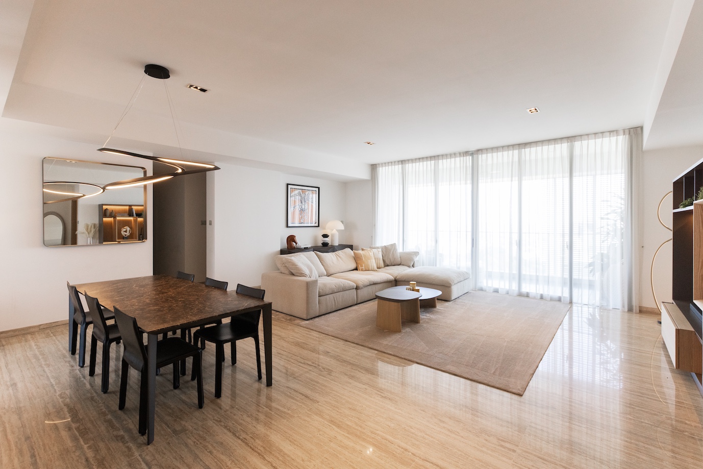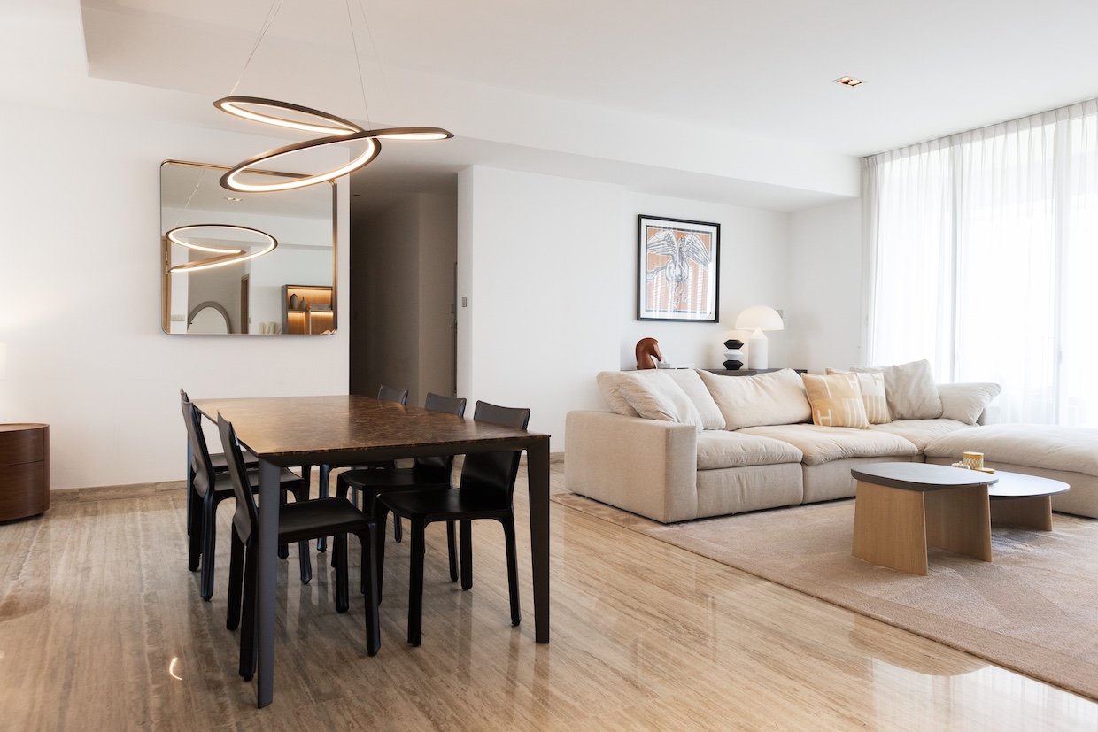 照明計画も全面的にアップグレードしました。上質な間接照明が加わることで、空間の奥行きと格調が劇的に高まります。ペンダント、フロアランプ、テーブルランプをすべて刷新し、モダンでありながら温かみを纏う、”住まう人の品格が滲み出るインテリア”を実現しました。